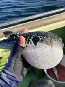 その後、少し移動し、周りもポツポツ釣れ始めますが、サバフグ、トラフグです。